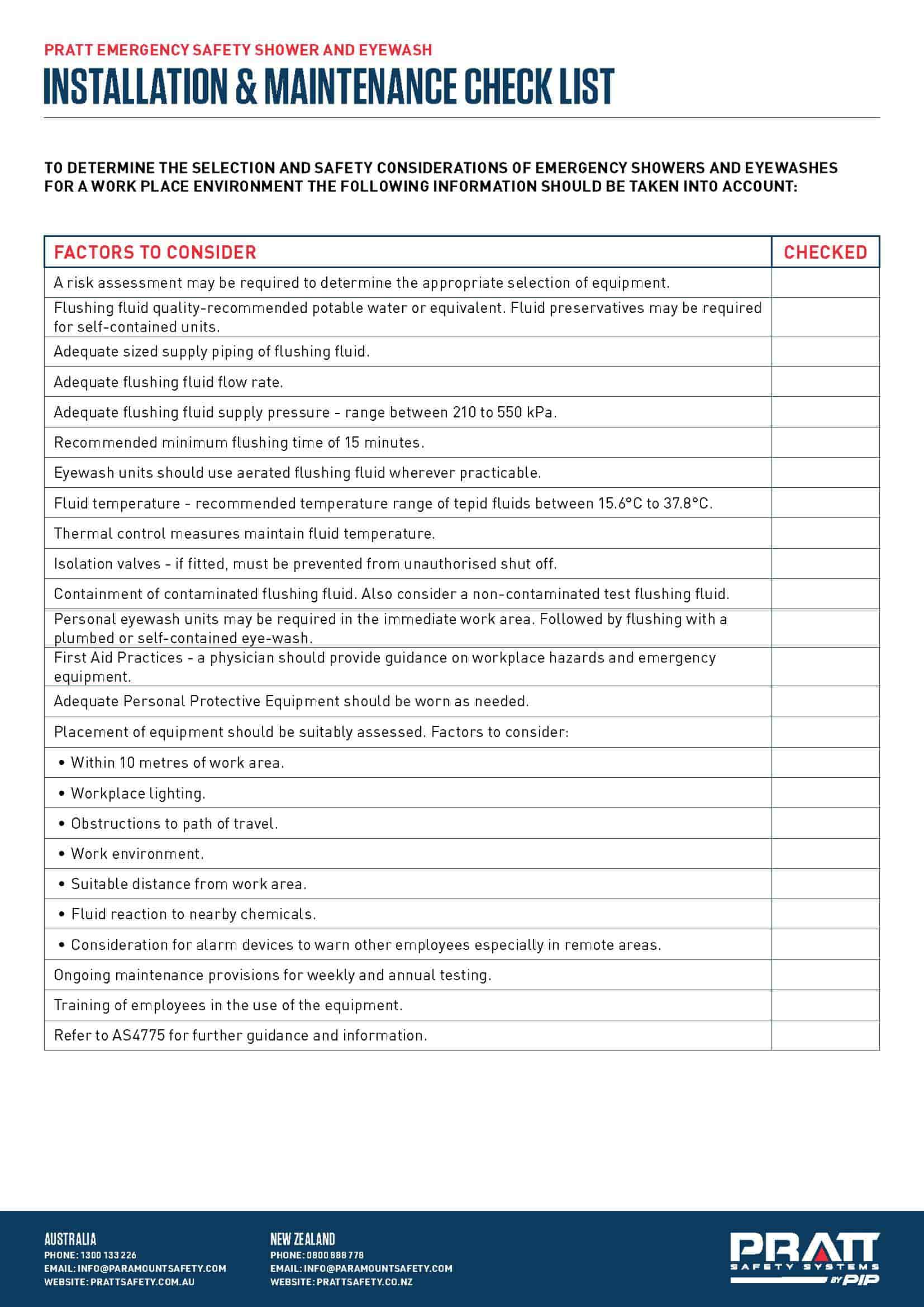 Enter your details to download a copy of our Safety Shower an Eye Wash Checklist.This download includes a 4 page checklist with information that will help ensure correct installation and maintenance of your PRATT Safety Shower and Eye Wash.